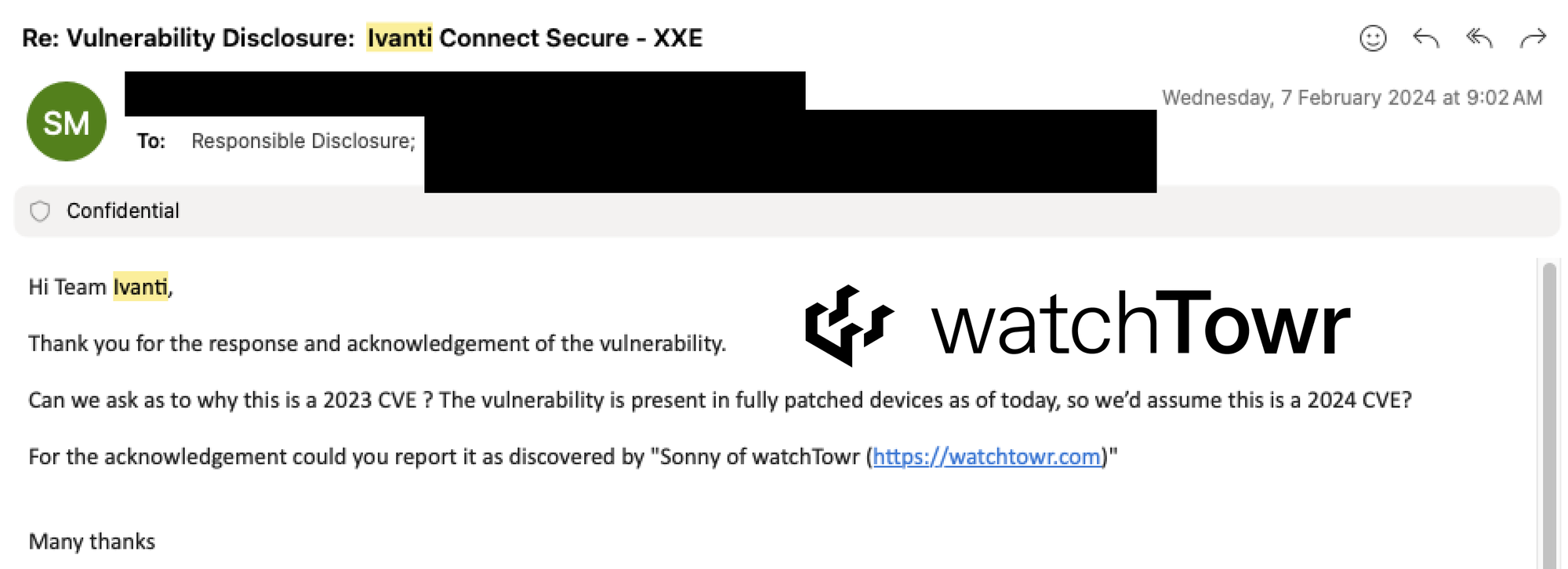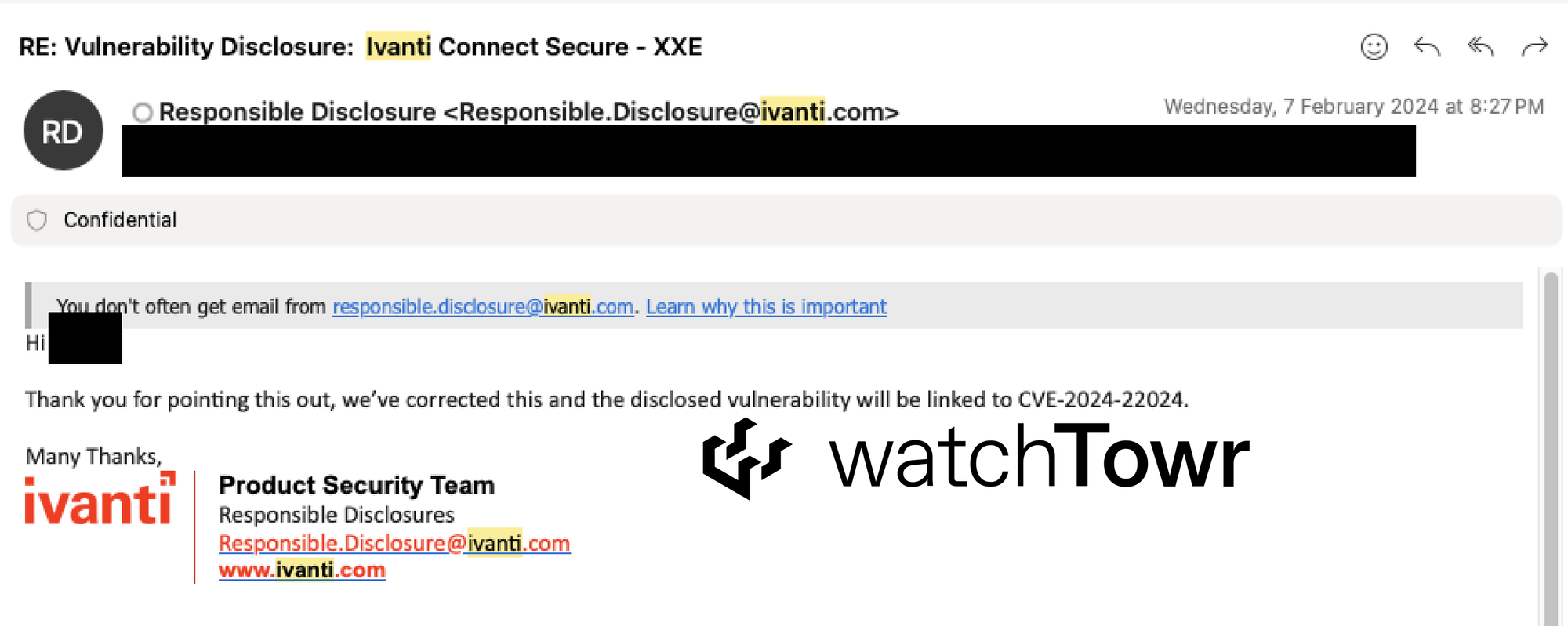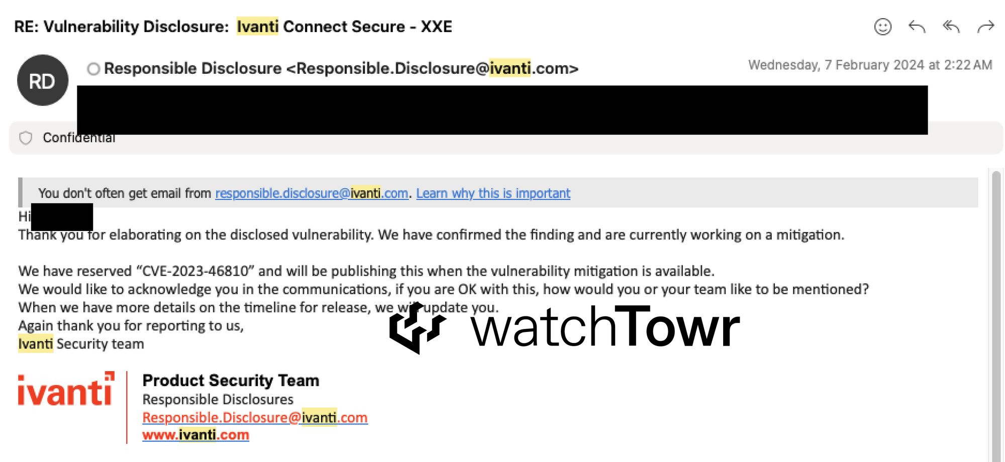 On Wednesday 7th February 2024, Ivanti acknowledged this vulnerability and assigned a CVE.