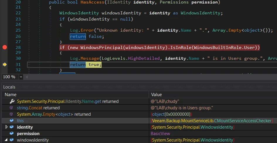 We are exploiting the Veeam Mount Service and it seems that its authorization checks are implemented in the Veeam.Backup.MountServiceLib.CMountServiceAccessChecker.HasAccess method: