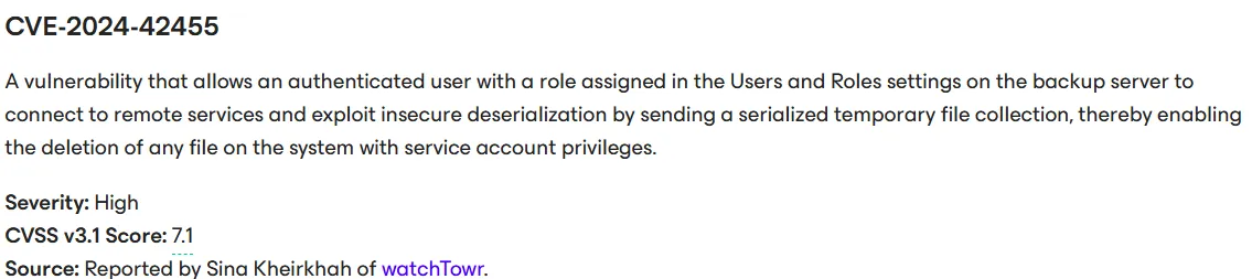 If you're reading security advisories and RFC specs before you sleep, and you stumble upon the Veeam KB 4693 advisory, you'll quickly notice CVE-2024-42455 - a vulnerability previously discovered by watchTowr Labs member Sina.