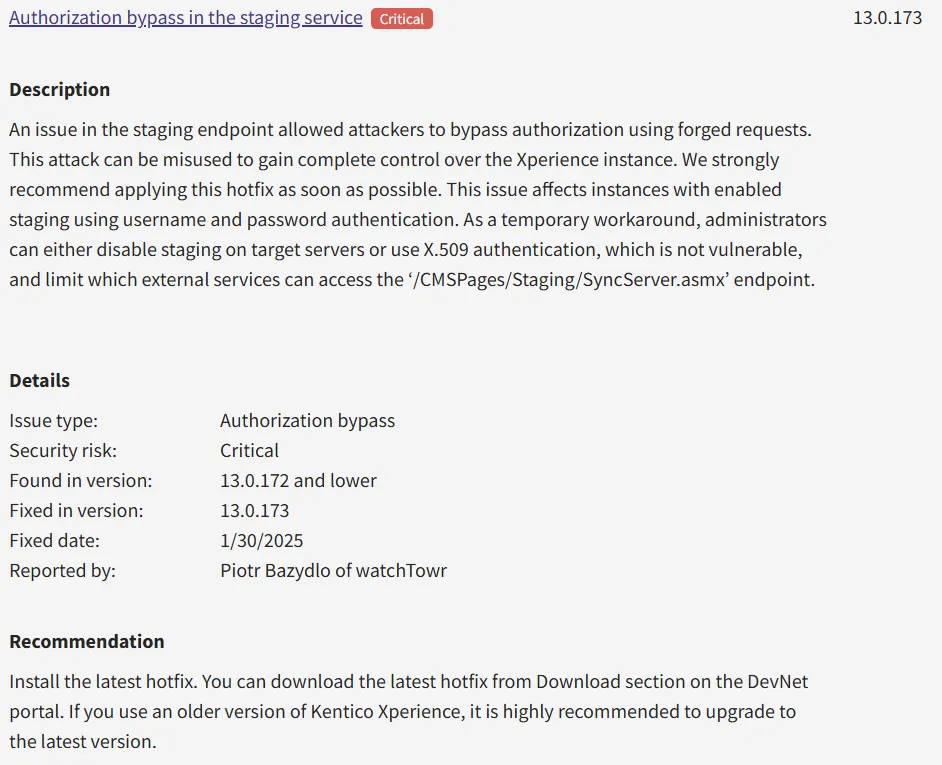 - WT-2025-0006 Authentication Bypass, exploitable on Kentico Xperience 13 < 13.0.173.