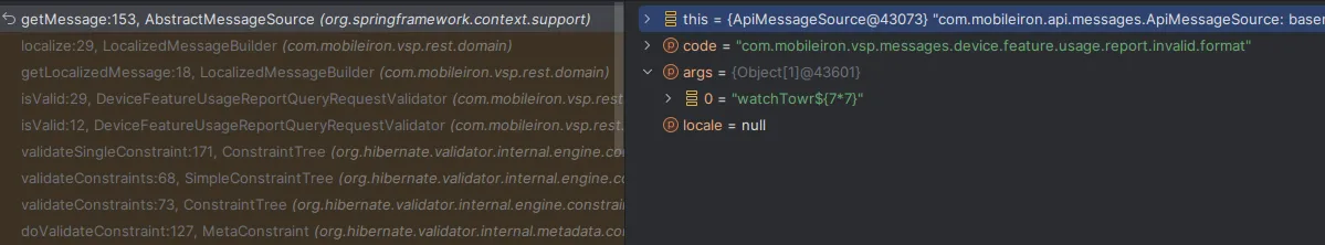 Using our debugger, we stuck a breakpoint at the moment the template is evaluated in DeviceFeatureUsageReportQueryRequestValidator.class: