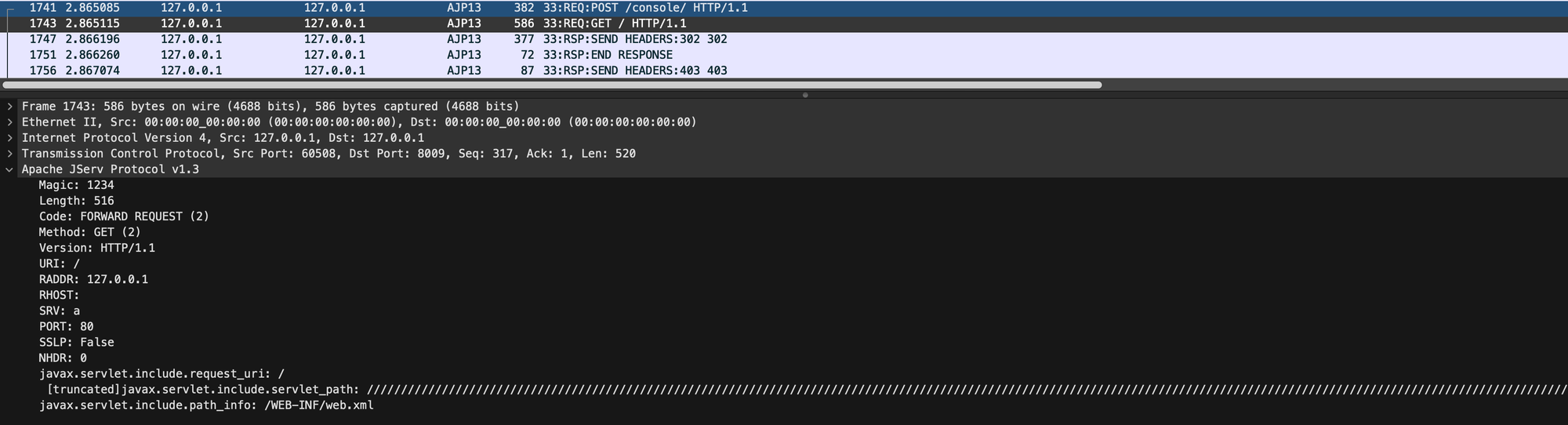 In the context of QRadar, users typically don’t have direct access to the AJP protocol. Instead, they access it indirectly, sending an HTTP request to /console URI. Anything after this /console endpoint is translated from an HTTP request to an AJP binary packet, which is then actioned by the Java code of the application.
