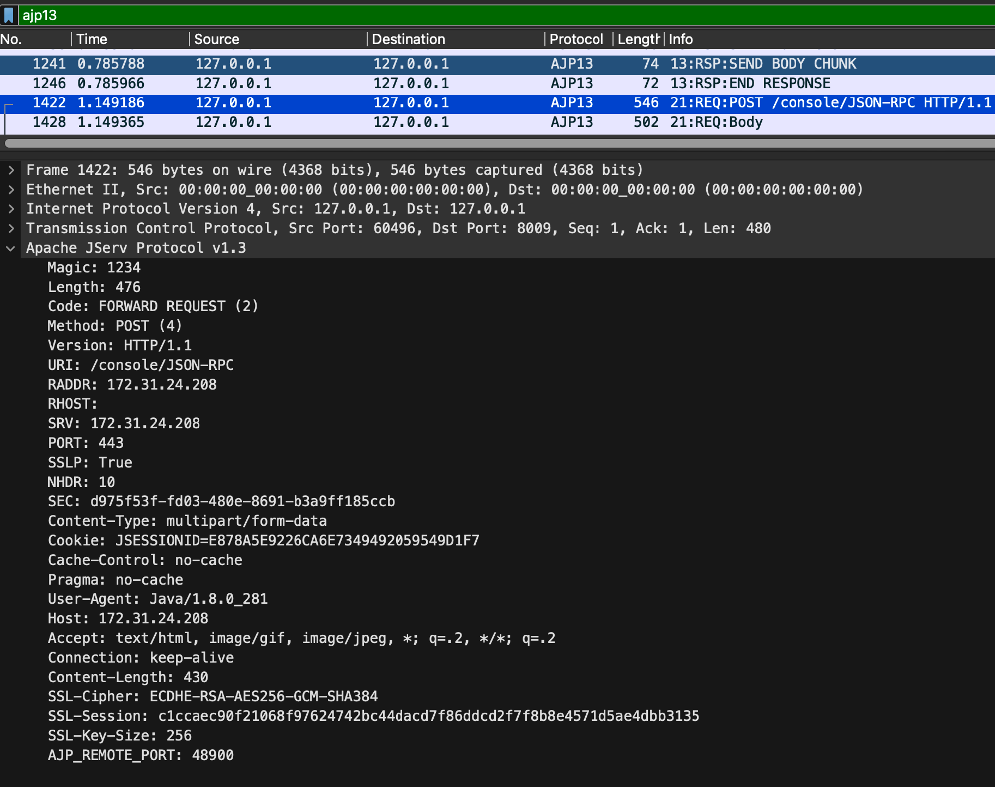 Below is an example viewed within WireShark that shows a single HTTP request to a /console endpoint. We can see that this results in a single AJP packet being issued. It’s important to note, for later on, the ‘one request to one packet’ ratio - every HTTP request results in exactly one set of AJP packets.