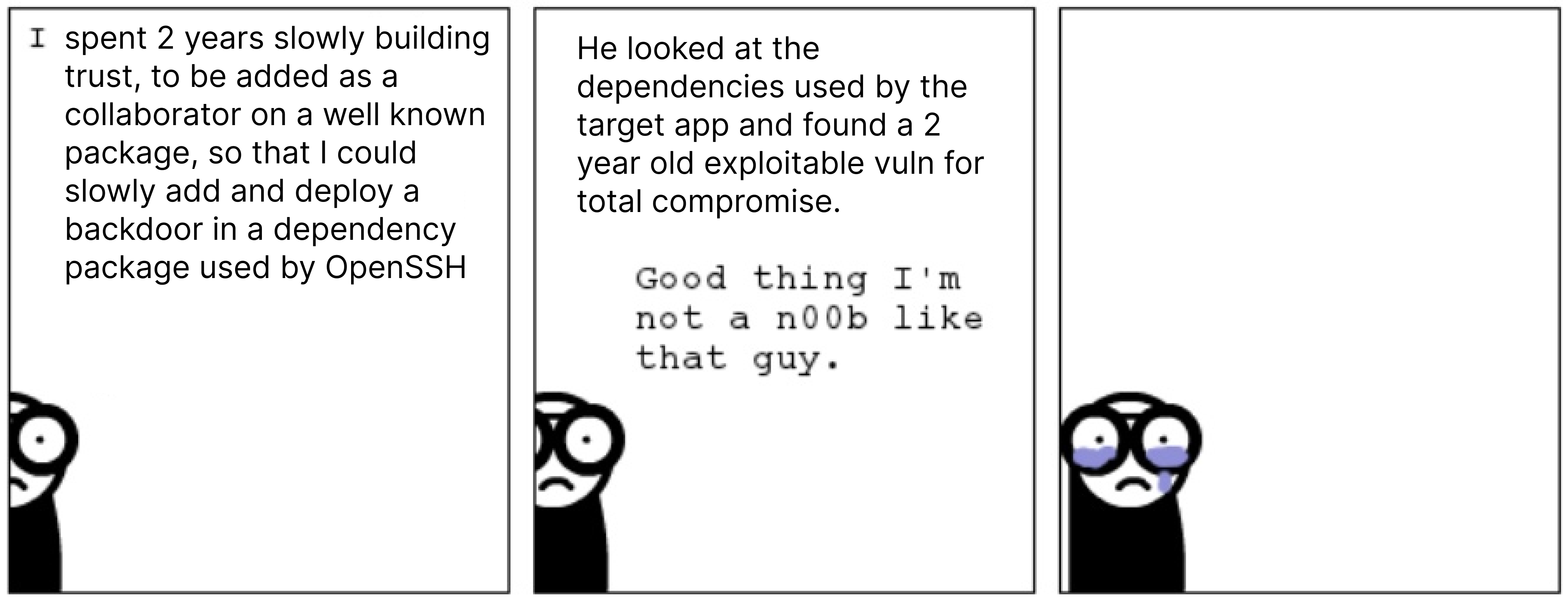 In addition, we've seen surreptitious and patient threat actors light our industry on fire with slowly introduced backdoors in the XZ library.
