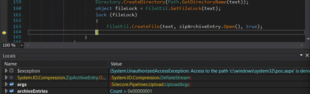 When we craft a special filename, we are able to reach the code at [2] and have our filename prepended with a valid webroot for Sitecore! We can create a ZIP file, which internally stores a file called: