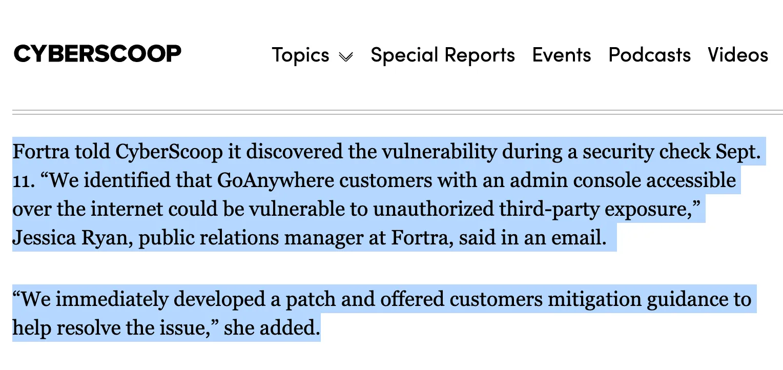 Since Part 1, we have been given credible evidence of in-the-wild exploitation of Fortra GoAnywhere CVE-2025-10035 dating back to September 10, 2025. That is eight days before Fortra’s public advisory, published September 18, 2025. This explains why Fortra later decided to publish limited IOCs, and we're now urging defenders to immediately change how they think about timelines and risk.