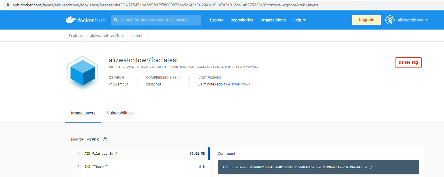 $ curl --location --header "Authorization: Bearer eyJhbGci<snip>gDHzIqA" https://registry-1.docker.io/v2/alizwatchtowr/foo/blobs/sha256:9358dad6bc6da9103d5c127dc2e88cbcf3dd855d8a48e3e7b7e1de282f87a27f -o uploaded.gzAt this stage, however, there is no DockerHub repository which references the file. In order to reference the file, we must modify the manifest of a tag to specify our new file by hash. This is easiest if we work from an existing repository, so I built a simple 'hello world' style repository, built it, and issued a docker inspect command to view its manifest. As you may recall from above, this manifest lists (among other things) the hash of filesystem images. We will simply alter this, changing one to the sha256 hash of the image we uploaded previously.