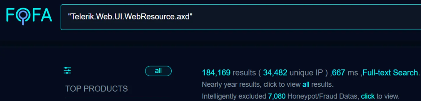 To demonstrate this, a simple FOFA engine search for HTTP responses containing the popular handler of this library (Telerik.Web.UI.WebResource.axd