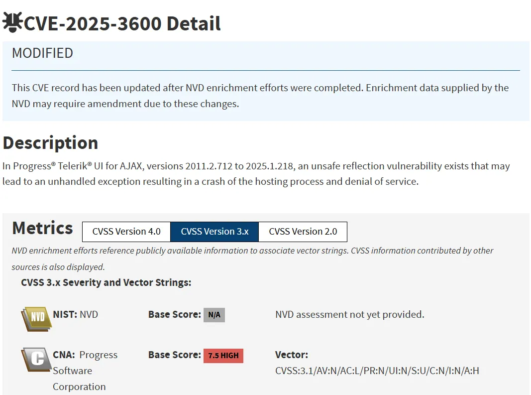 The vulnerability affects Telerik UI for ASP.NET AJAX releases from 2011.2.712 through 2025.1.218. That is a wide window, and real-world patching has been slow: We have already found enterprise products still running vulnerable versions months after the fix. In reality, licensing and upgrade practices are likely major factors in that lag - combined with teams not prioritizing ‘DoS’ vulnerabilities.