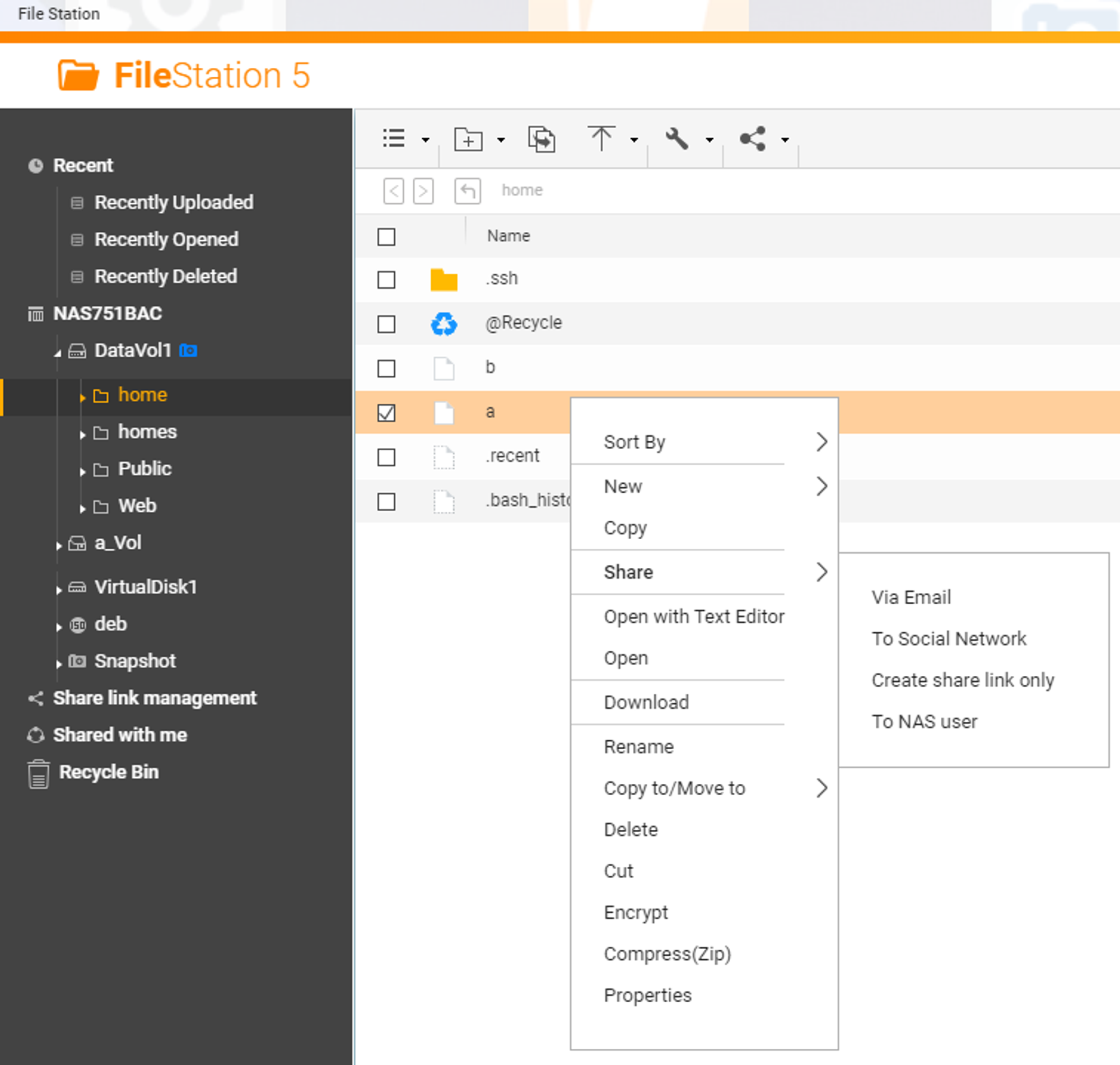 A quick demonstration might be better than trying to explain. Here’s what a NAS user might do if they want to share a file with a user who doesn’t have a NAS account (for example, an employee at a client organization) - they’d right-click the file and go to the ‘share’ submenu.