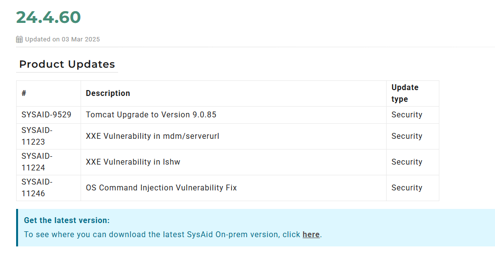 | 03 March 2025 | SysAid publishes version 24.4.60 fixing the reported vulnerabilities (no CVEs assigned) |