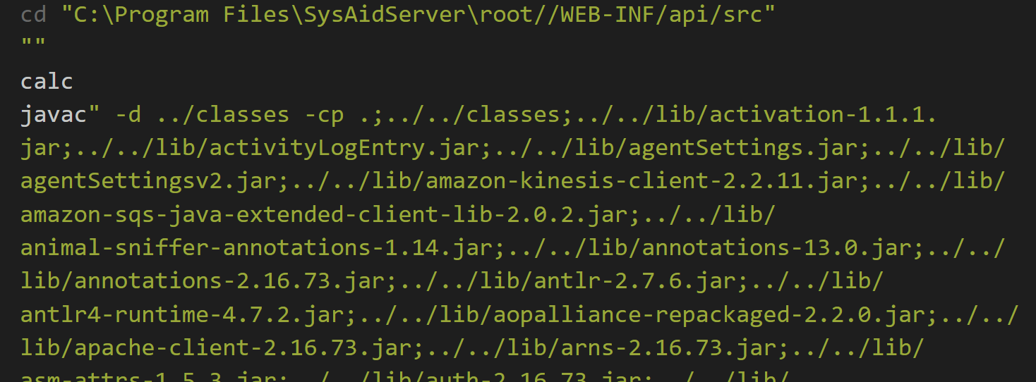 As you can see, C:\\java\\bin\\ is the current Java path, and the remainder of the file contains multiple shell commands that execute Java code to ultimately generate API information about the current SysAid instance.
