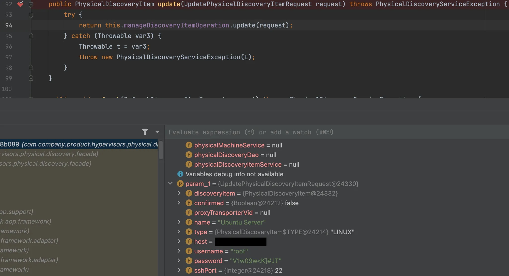 Finding this within the library (com/company/product/hypervisors/physical/discovery/core/PhysicalDiscoveryService.class) and setting a breakpoint allows us to dump the cleartext credential for the server: