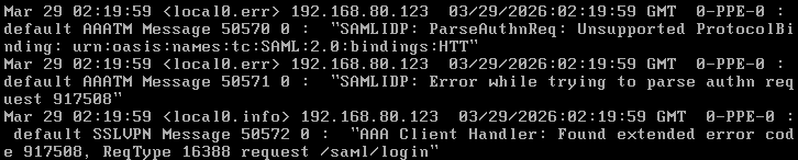 </samlp:AuthnRequest>While the HTTP response returned contained yet another boring, uninspiring, enterprise-grade error message, we in parallel monitored the NetScaler's log files.