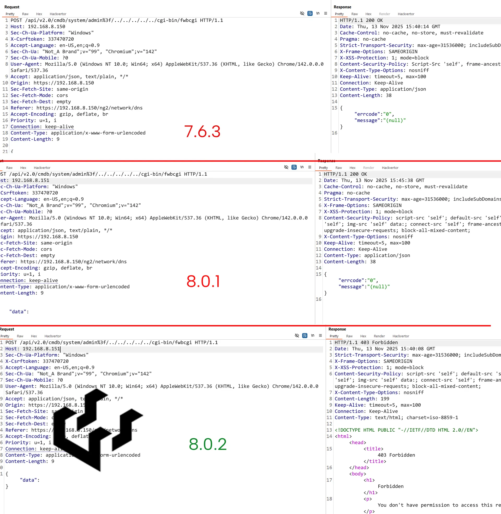 While patch notes for FortiWeb 8.0.2 don’t include a reference or mention of any resolved vulnerabilities, the results from our internal testing labs show that 8.0.2 is mysteriously patched for this mysterious vulnerability: