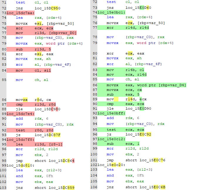 Disregarding the noise, we can see that a number of movzx instructions have been added to the code (the vulnerable version is on the left, the fixed on the right). This is interesting as the movzx instruction - or "MOVe with Zero eXtend" - typically indicates that a variable with a smaller datatype is being converted into a variable of a larger datatype. For example, in C, this would usually be expressed as a cast: