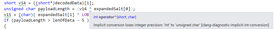 v14, here, is just a temporary value which holds a 16-bit length obtained from the decoded data. The payload length is obtained by XOR'ing this 16-bit value with the first byte of the expanded salt. This is where the bug manifests - can you spot it?